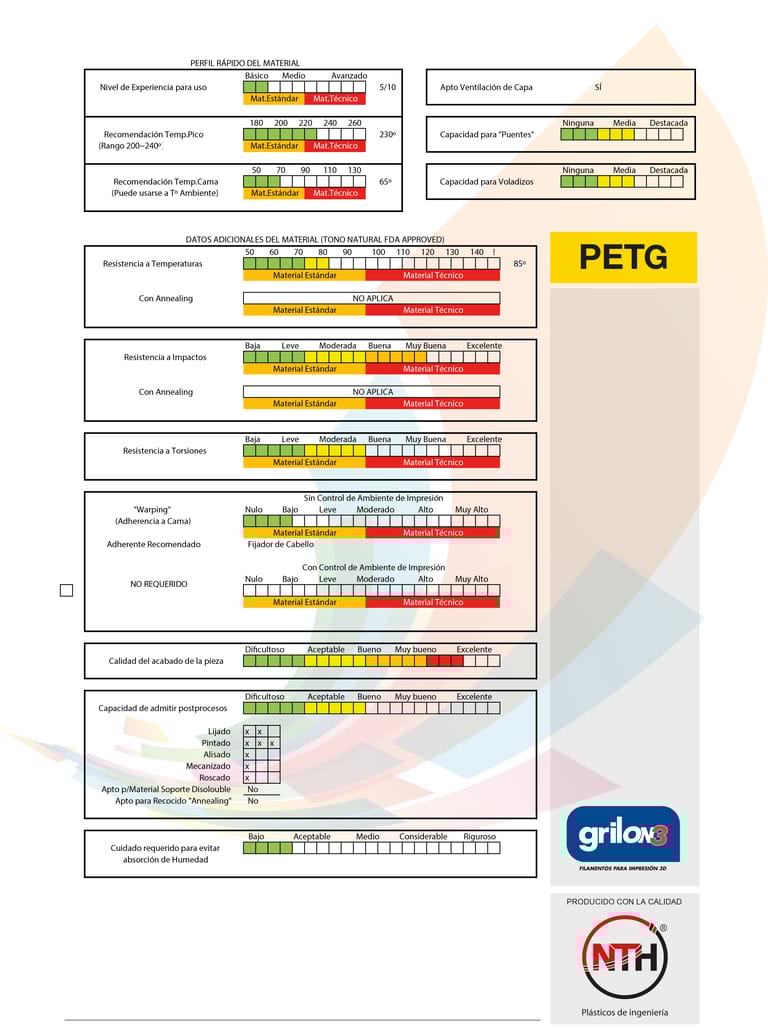 Posee muy buena resistencia mecánica y mayor resistencia térmica que el PLA. Excelente relación precio/prestaciones/usabilidad.